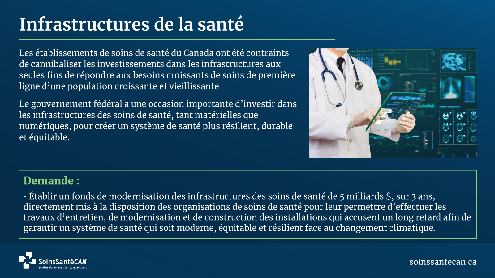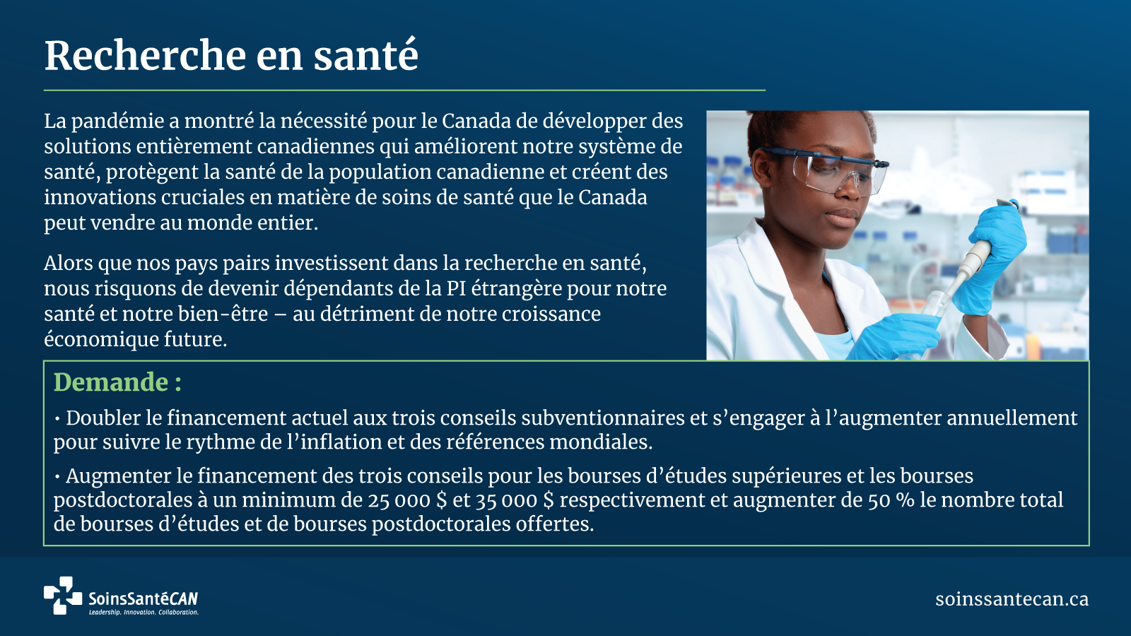 Le budget de 2024 offre au gouvernement fédéral une occasion cruciale de démontrer son engagement à renforcer véritablement les soins de santé et la recherche en santé au Canada, des questions qui restent des priorités essentielles pour la population de tout le pays. Sans investissements fédéraux supplémentaires pour soutenir sa modernisation, le système de santé continuera de se détériorer et le Canada continuera de se laisser distancer par ses pays pairs.